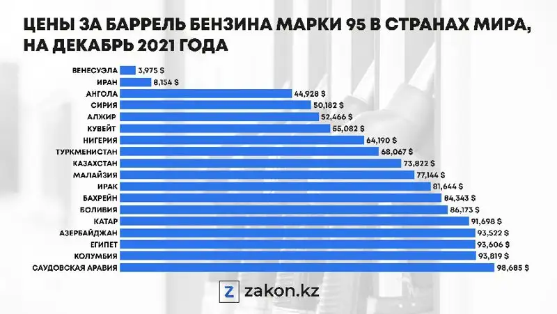 Самые низкие цены в мире на бензин в Венесуэле, Иране, Сирии, Анголе, Алжире, Кувейте и Нигерии. Из постсоветских стран в десятку стран с самым дешевым бензином входит Туркменистан. Казахстану политика регулирования отрасли позволяет занять девятую строчку в этом рейтинге.