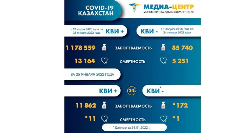 Информацию о заболеваемости коронавирусной инфекцией в Казахстане на 26 января 2022 года предоставил Минздрав РК.