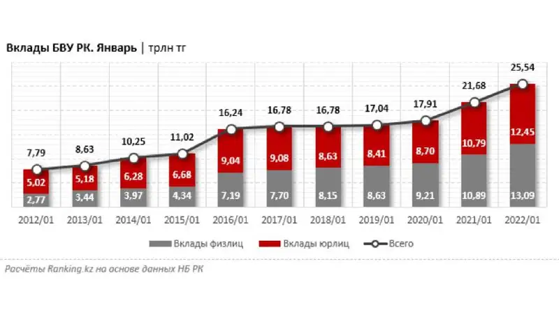 В проблемном январе 2022 года совокупный объем вкладов БВУ РК сократился сразу на 1,8% и составил к 1 февраля лишь 25,54 трлн тг. По сектору из 22 БВУ РК в минусе 13 банков, в топовой десятке — половина.