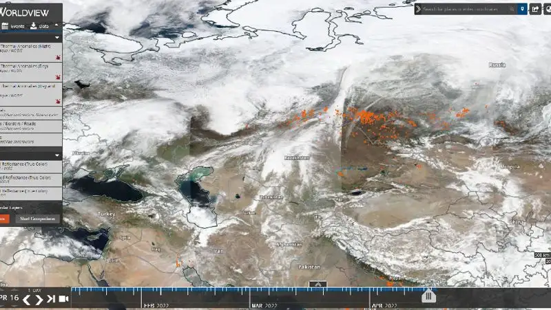 По карте NASA 16-17 апреля наблюдались очаги возгорания в Павлодарской и Северо-Казахстанской областях. Данные пожары могли оказать влияние на задымление, наблюдаемое сегодня в столице.