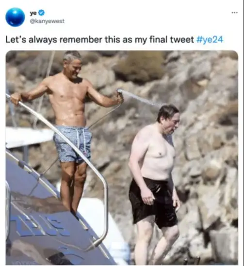 Маск ответил на фотографию Уэста из отпуска словами – "все в порядке", уточнив при этом, что аккаунт Уэста "приостановлен за подстрекательство к насилию, а не за нелестную фотографию, на которой меня поливают из шланга. Честно говоря, я нахожу эти фотографии полезной мотивацией для похудения!".
