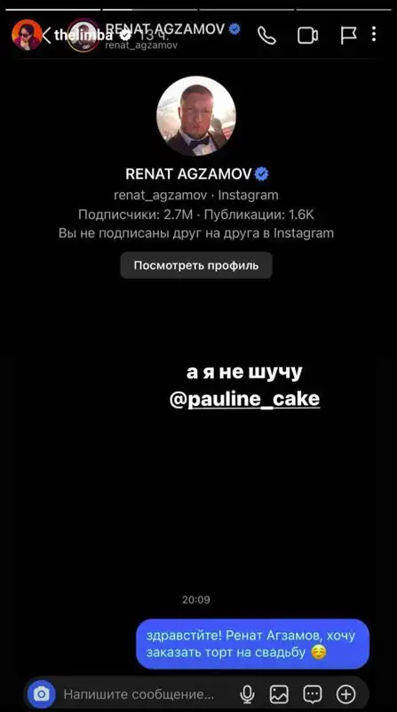 Кроме того, в сториз артист опубликовал сообщение к знаменитому кондитеру Ренату Агзамову. Певец пишет, что хочет заказать у него свадебный торт.