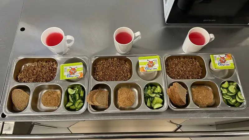 Сегодняшнее меню в школе состоит из гречневой каши, говяжьей котлеты, свежих огурцов, ржаного хлеба и йогурта, а вместо чая – кисель.