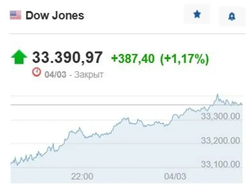 На момент закрытия Dow Jones подорожал на 1,17%, увеличившись за неделю на 1,75%, или на 574,05 пункта, до 33 390,97 пункта.