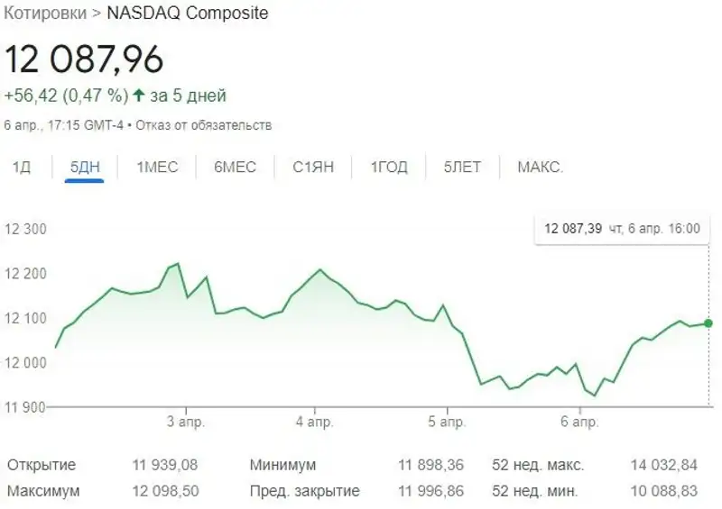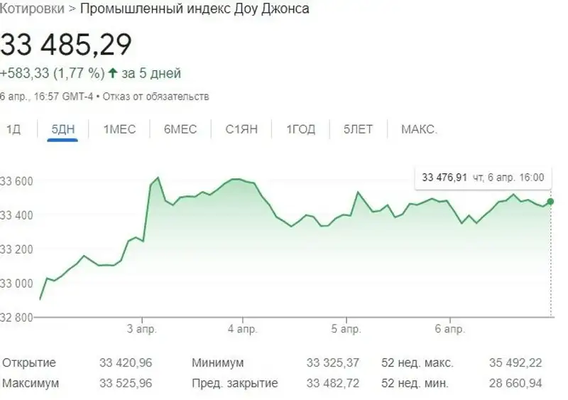 В четверг, 6 апреля, на момент закрытия на Нью-Йоркской фондовой бирже Dow Jones подорожал на 0,01% (+211,14 пункта, или +0,63% за неделю)
