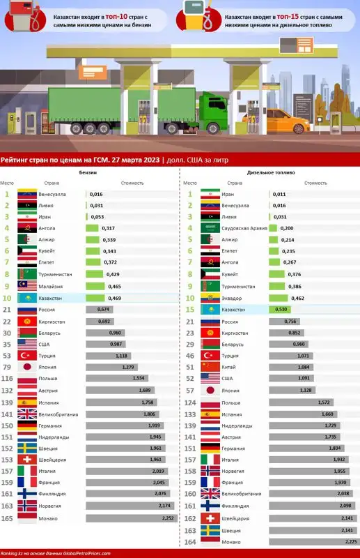Что касается цен на нефтепродукты, общеизвестно, что в Казахстане они одни из самых низких в мире. Так, РК входит в топ-10 стран с самым дешевым бензином и топ-15 стран с самым дешtвым дизтопливом. Со странами ближнего зарубежья, Европы и Америки разница может составлять несколько раз. Более детальные данные представлены в инфографике.