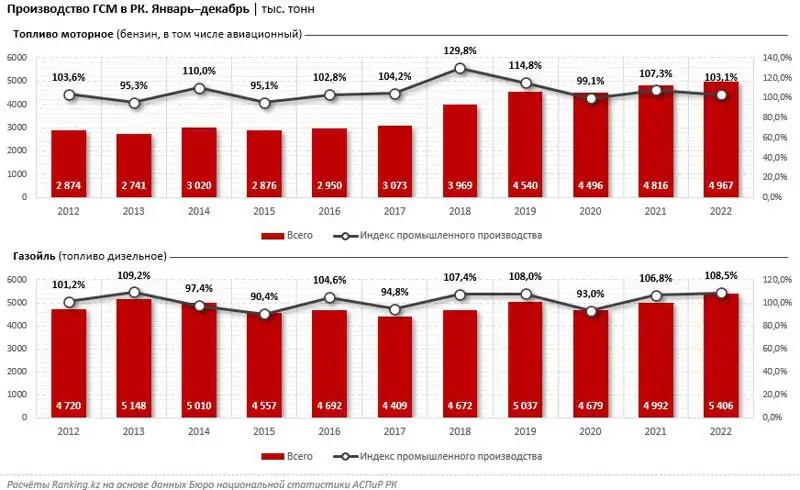 В целом, по его словам, в 2022 году производство как дизтоплива, так и бензина продемонстрировало рекорд: выпуск дизельного топлива увеличился на 8,5%, до 5,4 млн тонн, бензина — на 3,1%, до 5 млн тонн.