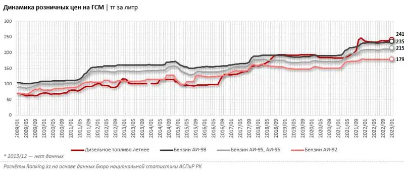 В целом, если рассматривать изменение цен на бензин и дизельное топливо в РК в исторической динамике, можно отметить, что рост происходил умеренными темпами по сравнению с другими социально значимыми продуктами и товарами. Ниже в инфографике видно, что существенных скачков в секторе никогда не наблюдалось; кроме того, установленная цена держится в пределах одного уровня достаточно долгое время, так как регулируется со стороны государства в лице уполномоченных органов.