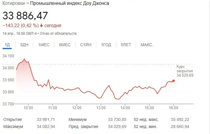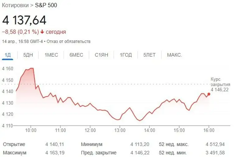 В пятницу 14 апреля после роста в течение часа основной сессии индексы выросли: Dow Jones на 18 пунктов, или на 0,1%, в то время как индекс S&P 500 вырос на 0,4%, а NASDAQ Composite — на 0,2%.
