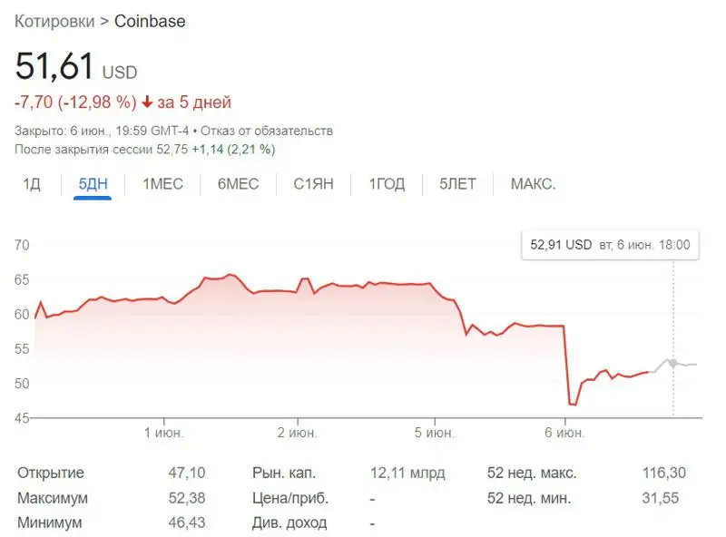 После заявлений SEC акции компании Coinbase, которая торгуется на NASDAQ, также упали до 47 долларов за бумагу.
