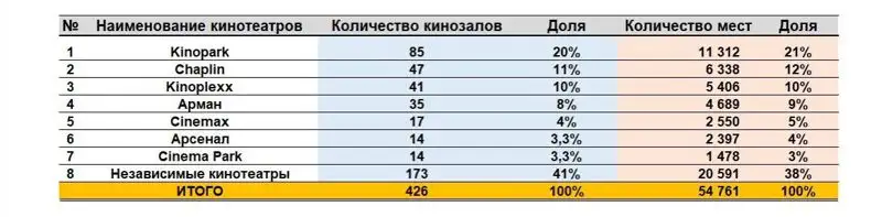 На данный момент по статистике, предложенной сетью кинотеатров Kinopark, в республике функционирует всего 426 кинозалов. На этом числе сказались многие факторы, в том числе пандемия, но факты налицо – в стране, чье население неуклонно приближается к 20 миллионам, открыто всего 100 кинотеатров в 38 крупных городах, в остальных 65 процентах городов эта услуга недоступна. При этом цифры говорят, что потребность в кинотеатрах – не только в городах поменьше, но и СНП – в десятки раз превышает эти показатели. Сегодня казахстанцам нужны как минимум 2 000 кинозалов, то есть не менее 500-700 кинотеатров в городах, поселках и даже аулах. Ситуация с распределением существующих кинозалов по компаниям кинопроката выглядит так:
