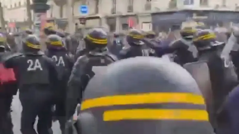 Отмечается, что во время акции участники начали забрасывать полицию камнями, против манифестантов был применен слезоточивый газ. Колонна манифестантов движется от площади Республики к площади Нации. Участники несут агитационные плакаты, призывающие голосовать за левых, и жгут файеры. У многих в руках флаги Палестины. Ряд СМИ пишут, что некоторые участники разбивают автобусные остановки и рекламные витрины, поджигают мусорные баки.