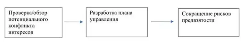 Управление отдельными конфликтами интересов должно быть направлено на уменьшение возможности риска коррупции и нарушений. К примеру, управление конфликтом интересов состоит из нескольких этапов: