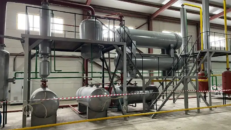 Непосредственно производственный процесс начинается с сортировки ТБО. Затем отсортированные отходы в виде брикетов или россыпью загружают в роторный реактор термической деструкции, где последовательно происходят следующие процессы: подогрев, расплавление, удаление влаги, испарение и переход в парогазовой фазе в систему охлаждения и конденсации.