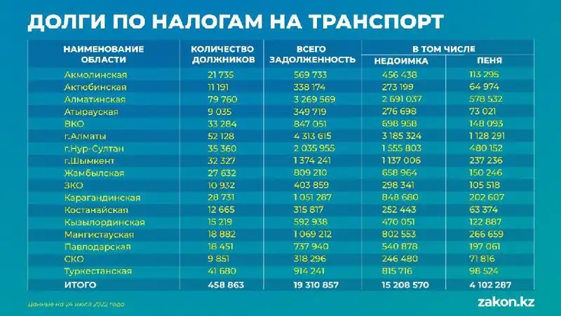 Эту сумму не выплатили 458 863 казахстанца. Средняя задолженность по налогу на транспорт составила 42 тысячи тенге.