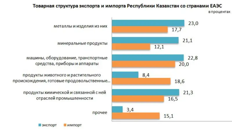 При этом в общем объеме внешнеторгового оборота Казахстана со странами ЕАЭС большую долю занимает Россия – 92,3%, далее следуют Кыргызстан – 4%, Беларусь – 3,5% и Армения – 0,2%.