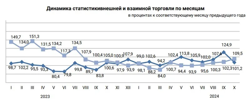 Экспорт со странами ЕАЭС составил 8704,2 млн долларов, или на 8,9% меньше, чем в январе-октябре 2023 года, импорт – 15 376 млн долларов США, по сравнению с соответствующим периодом прошлого года увеличился на 3,9%.
