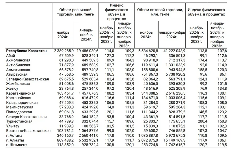 Объем розничной торговли за январь-ноябрь 2024 года составил 19 486 млрд тенге, что на 9,3% больше уровня соответствующего периода прошлого года, сообщается в сборнике "Социально-экономическое развитие Республики Казахстан" за ноябрь.