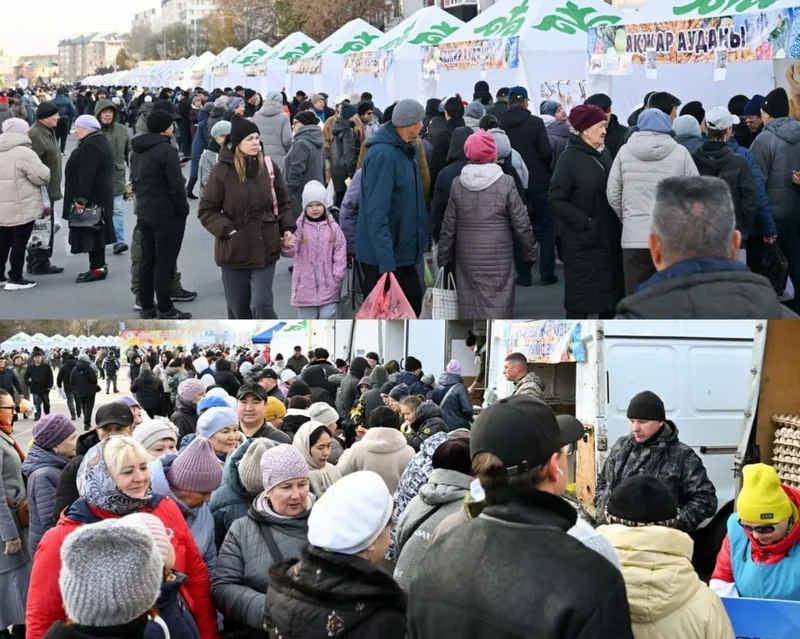 С раннего утра на ярмарку пришло много людей. Первая площадка – ул. Жумабаева в центре города: здесь работает продовольственная ярмарка, праздничное настроение поддерживает концертная программа.