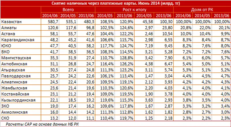 Самый высокий месячный скачок по снятию наличных зафиксирован на юге. В Кызылординской области рост на 19,6% (на 3,6 миллиарда тенге), в Южно-Казахстанской на 17,7% (на 7,2 миллиарда тенге). В целом, по Казахстану среднемесячный темп роста оборота по снятию наличных за июнь 2013-2014 держался на уровне 2,6%.