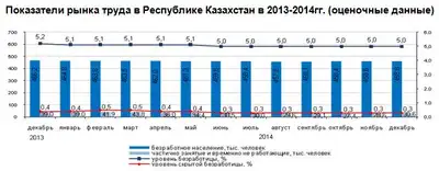 Численность безработных в декабре 2014 года, по оценке, составила 458,8 тыс. человек, уровень безработицы - 5,0%. Официально на конец декабря 2014 года зарегистрированы в органах занятости - 33,4 тыс. человек (без учета лиц, включенных в состав участников программы «Дорожная карта занятости 2020»). Доля зарегистрированных безработных составила 0,4% от экономически активного населения (в декабре 2013г. - 0,3%).