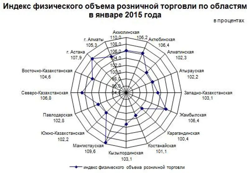 Наибольший удельный вес в общем объеме розничной торговли республики в январе 2015 года составляет г. Алматы (31,7%), г. Астана (10,3%) и Карагандинская область (9,8%).