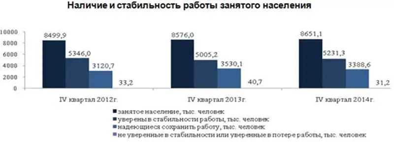 По результатам опроса респондентов в IV квартале 2014 года 60,5% от общего числа занятого населения были уверены в стабильности своей работы (занятия) (в 2013году - 58,4%).