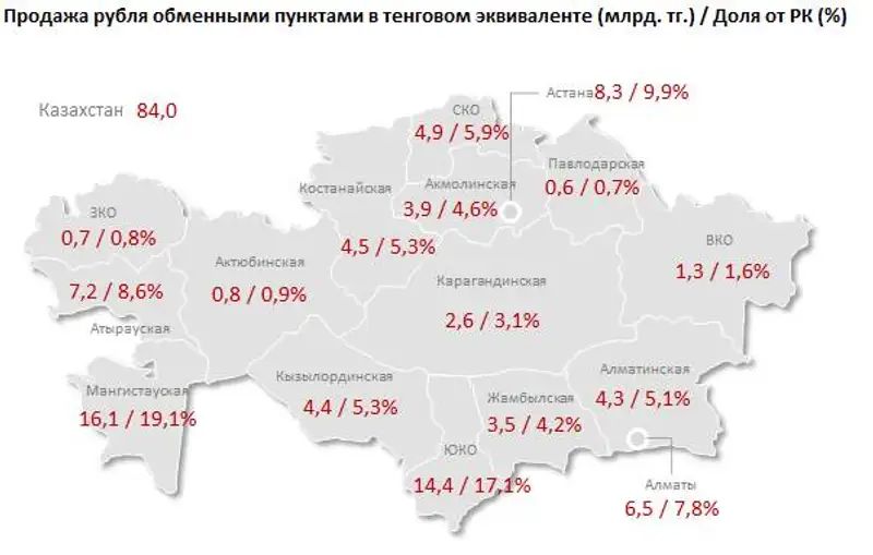 Всего российской валюты продано на 84 миллиарда тенге. Для