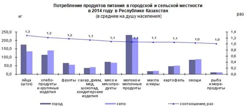 При сравнении потребления основных видов продуктов питания населением в сельской и городской местности в 2014 году наибольшая дифференциация отмечается по потреблению яиц, хлебопродуктов и крупяных изделий, фруктов.