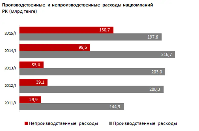 Производственные расходы национальных компаний в отчетный период снизились на 9%, в то время как непроизводственные выросли на треть (33%). Причем, средний темп роста этого показателя (период к периоду) - 61%. Если в 2011 году на 1 тенге непроизводственных расходов приходилось 4,85 тенге, потраченных строго на производство товаров и услуг, то теперь это соотношение выглядит как 1:1,51.