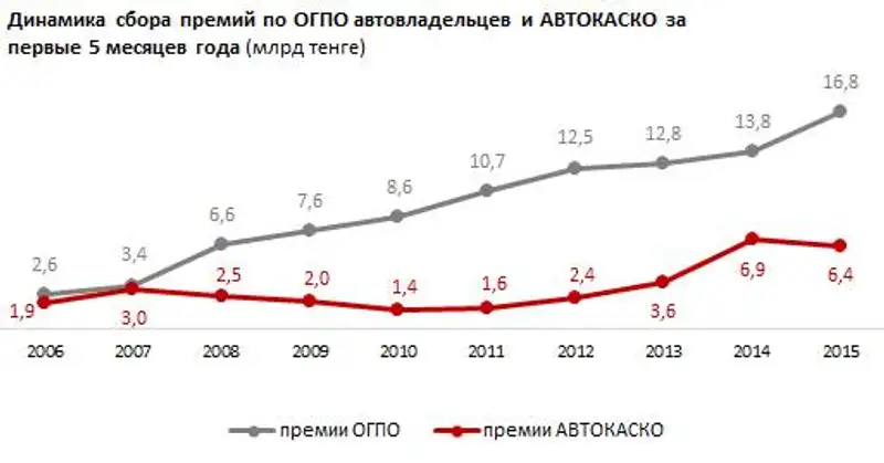 Такой же прирост в течение первых 5 месяцев был зафиксирован в докризисном 2008 году. В то же время АВТОКАСКО показывает снижение популярности в Казахстане - на 7% по сравнению с январем-маем 2014 г., или на 0,5 млрд. тенге. На ОГПО автовладельцев приходится 14% всего страхового рынка, а АВТОКАСКО аккумулирует всего 5% совокупных премий. Рост сборов ОГПО коррелирует с увеличением числа автомобилей в Казахстане - за отчетный период по сравнению с предыдущим их количество выросло на 22%.