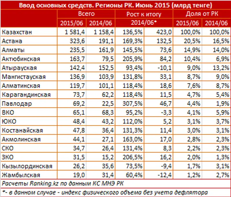 Стоимостное выражение объема вводимых основных средств в минувшие полгода выросло на 36,5%. Если в январе-июне 2014 года основных средств было введено на 1,16 трлн тенге (6,2 млрд долларов), то в аналогичный период этого года уже на 1,58 трлн тенге (8,4 млрд долларов). Пятая часть всех вводимых основных средств имеют столичную прописку, 14,9% республиканского объема пришлось на Алматы, 10,4% - на Актюбинскую область.
