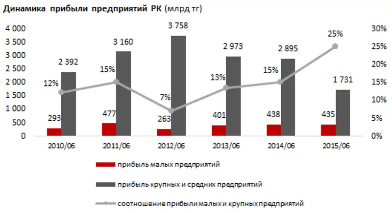 По итогам I полугодия 2015 года малые предприятия РК сохранили прошлогодний уровень прибыли* в 435,0 млрд тенге (-1%), в то время как крупные и средние предприятия заработали на 40% меньше, чем за январь-июнь 2014 года, или на 1,2 трлн тенге. Таким образом, прибыль малого бизнеса в текущем году выросла до 25% от прибыли большого бизнеса.