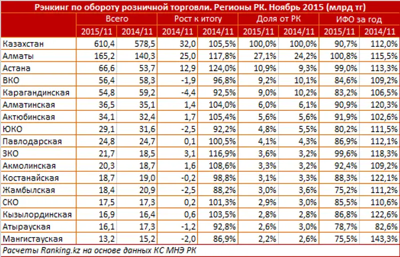 Среди областей наилучшие результаты торговли в ноябре показала ЗКО - рост денежного оборота на 16%, снижение ИФО всего на 0,4% и увеличение доли на рынке РК с 3% до 4%. В аутсайдерах - Жамбылская, Мангистауская и Атырауская области, где ИФО снизился более, чем на 20%. При этом в Мангистауской области денежный оборот сократился почти на 17%, в Жамбылской на 11,8%, это самые низкие показатели по РК.