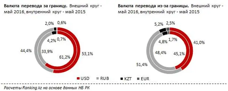 Основная причина роста объемов трансграничных переводов - девальвация нацвалюты, поскольку совокупная доля тенговых переводов в общем числе транзакций составила 3,2%. Рублю удалось занять свыше 50% рынка переводов в Казахстан, тогда как, несмотря на снижение доли, доллар остается самой популярной валютой для осуществления переводов за границу.