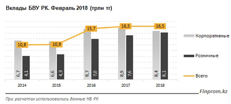 Совокупный объем вкладов БВУ РК к концу февраля 2018 составил 16,5 трлн тг - на 1,8% меньше, чем в январе текущего года. Впрочем, за год показатель практически не изменился. Из 32 БВУ РК депозитные портфели увеличили за год 17 банков.