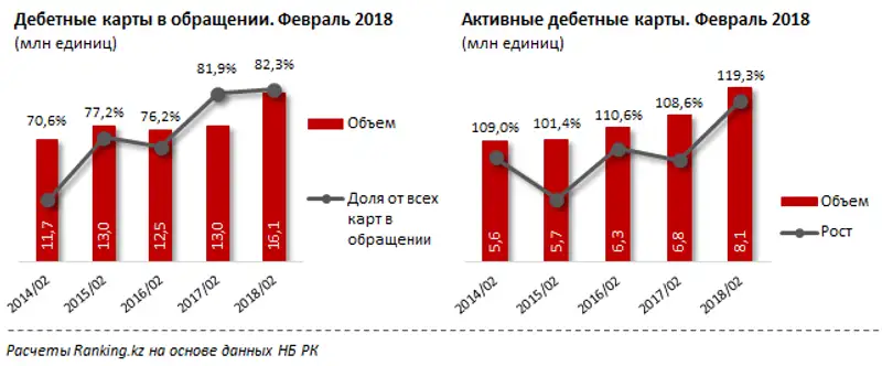 За год количество дебетных карт, находящихся в обращении, выросло сразу на 24,3%, и составило на конец февраля 2018 года 16,1 миллиона. Для сравнения, число кредитных карт увеличилось на 21,1%, прочих (предоплаченных карт и дебетных карт с кредитным лимитом) - на 18,5%.