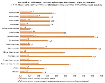 По регионам среди работников обследованных предприятий наибольшая доля занятых в условиях, не отвечающих санитарно-гигиеническим требованиям (нормам), отмечена в Мангистауской области - 42,9%, в Карагандинской - 41,3%, в Павлодарской - 40,2%, в Восточно-Казахстанской - 27,2%, в Жамбылской - 24,4%. Наименьшая доля работников отмечена в Западно-Казахстанской области (5,4%).