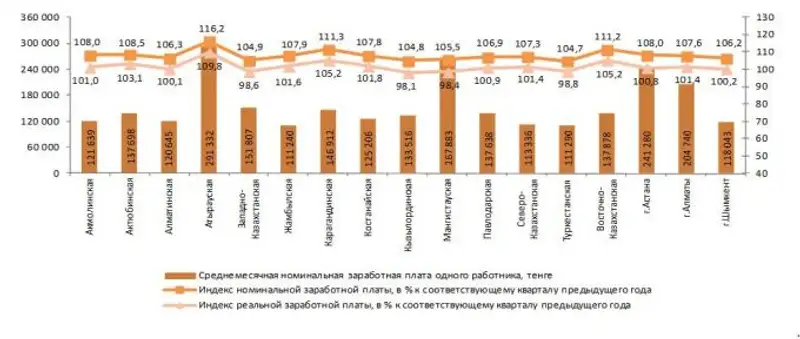 В региональном разрезе самая высокая номинальная заработная плата отмечена в Атырауской области - 291,3 тыс. тенге, что в 1,8 раз превышает среднереспубликанский показатель. В Жамбылской области ее величина составила 111,2 тыс. тенге, что на 31,7% ниже среднего уровня по стране.