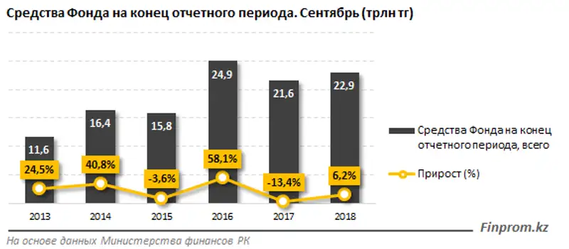 Средства Национального Фонда РК на конец сентября 2018 года составили 22,9 трлн тг, что на 6,2% больше, чем годом ранее - 21,6 трлн тг. Максимальный объем средств, находящийся на счетах Нацфонда, наблюдался в соответствующем периоде в 2016 году - 24,9 трлн тг.