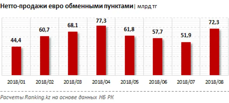Спрос на евровалюту в Казахстане заметно подскочил: к концу лета нетто-продажи евро обменными пунктами показали месячный рост почти на 40%,передает Zakon.kz со ссылкой на исследование ranking.kz.