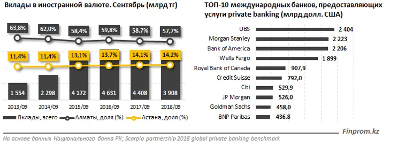 По нашей оценке, на данный момент потенциал рынка private banking составляет чуть более 1 трлн тг, следовательно, состояние сегмента богатых клиентов преимущественно находится за границей и обслуживается международными банками. В ТОП-25 крупнейших банков мира в 2017 году средства состоятельных лиц под управлением составляют 16,2 трлн долл. США. Крупнейшим private-банком является швейцарский UBS — 2,4 трлн долл. США активов под управлением.