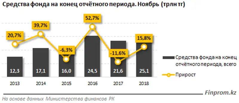 На конец ноября текущего года средства Нацфонда Казахстана достигли 25,1 трлн тенге, прирост составил 15,8% за год, передает Zakon.kz со ссылкой на исследование finprom.kz.