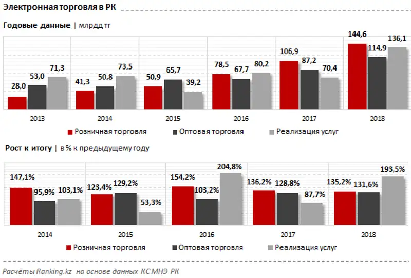 По итогам 2018 года объём торгов на внутреннем рынке через интернет составил 259,5 млрд тг — на 33,6% больше, чем за предыдущий год (194,2 млрд тг). Доля электронной торговли в общем объёме оптовой торговли составила 1,9%. Из них 144,6 млрд тг приходится на розничную торговлю через интернет (годом ранее — 106,9 млрд тг) и 114,9 млрд тг — на оптовую торговлю (годом ранее — 87,2 млрд тг). За 2018 год объём реализации услуг через интернет составил 136,1 млрд тг — на 93,5% больше, чем в 2017-м.