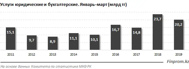 Объём услуг в сфере права и бухгалтерского учёта за первый квартал текущего года составил 20,2 млрд тг, что на 14,8% меньше, чем за аналогичный период 2018-го. Заметим, годом ранее показатель достигал 23,7 млрд тг — рекордный уровень за прошедшие годы.