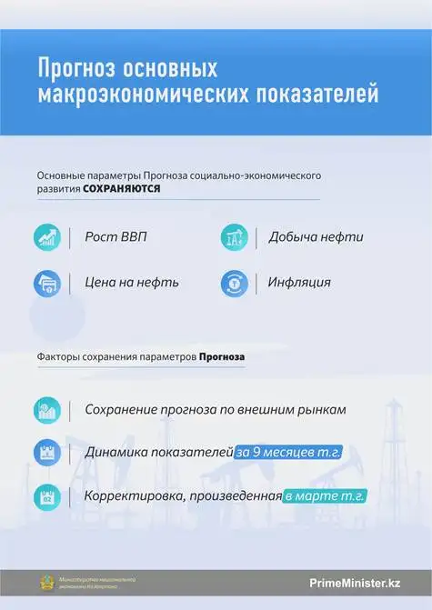 В ходе уточнения республиканского бюджета Премьер-Министру доложили, что с учетом сохранения основных показателей Прогноза социально-экономического развития страны на 2019 год, уточненные поступления в республиканский бюджет на 2019 год составят 7081,3 млрд тг, расходы - 12028,1 млрд тг. Это рост ВВП на уровне 3,8 %, добыча нефти в объеме 89 млн тонн.