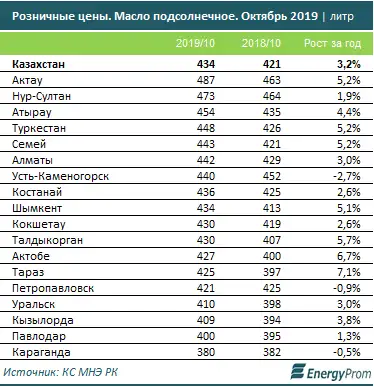 По РК рост цен за год (октябрь 2019-го к октябрю 2018-го) составил 3,2%, до 434 тг за литр подсолнечного масла. Заметим, рост цен в целом на продукты питания и безалкогольные напитки в этом же периоде составил 9,7%.