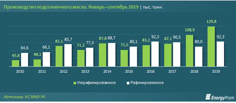 Производство в секторе на подъеме: выпуск нерафинированного масла увеличился за год на 19,2%, до 129,8 тыс. тонн за три квартала 2019-го, рафинированного — на 15,3%, до 92,3 тыс. тонн.