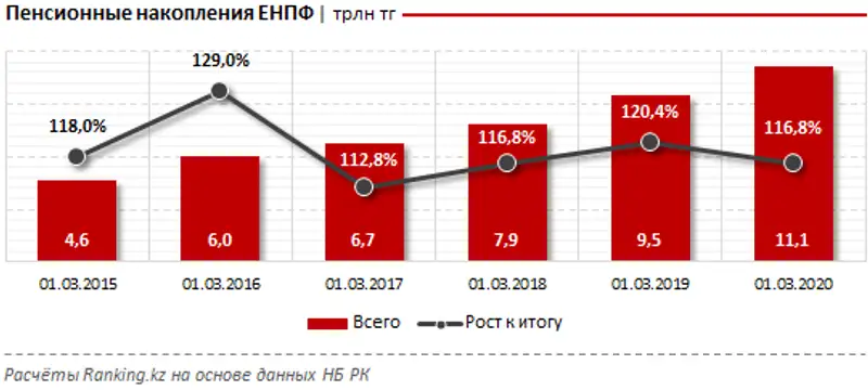 Количество счетов вкладчиков (получателей) с накоплениями на конец февраля 2020 года составило 10,7 млн — на 2,7% больше, чем в аналогичном периоде 2019-го (10,4 млн счетов). Общая сумма накоплений на счетах вкладчиков в анализируемом периоде составила 11,1 трлн тг, увеличившись на 16,8% за год. За последние пять лет пенсионные накопления в Казахстане растут в среднем на 19,2% за год.