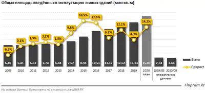 Именно запуск таких ключевых программ, как «Нұрлы жол», а впоследствии — «Нұрлы Жер» и прочих, привёл к колоссальному росту объёмов жилищного строительства в стране с 2014-2015 годов. Заметим, даже в текущем году, несмотря на пандемию и кризис в стране и мире, всего за квартал введено в эксплуатацию 2,64 млн кв. м жилья — лишь немногим меньше, чем в аналогичном периоде годом ранее. При этом это больше, чем, к примеру, за весь 2003 или 2004 годы. В прошлом же году строительство в жилищном сегменте достигло очередного рекорда: за 12 месяцев было сдано 13,13 млн кв. м жилья.